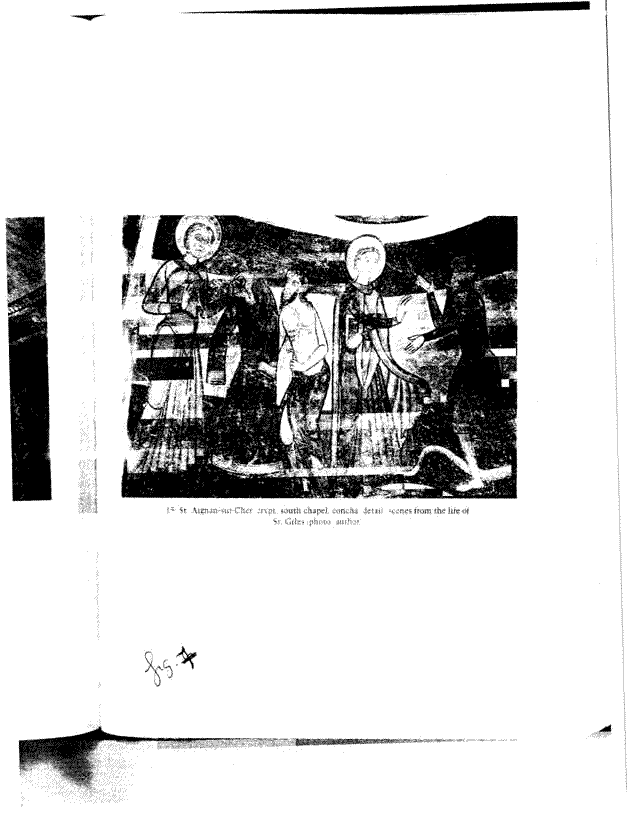 Fig. 7. Saint Giles clothing a beggar, wall painting c. 1200, in the crypt of the Collegiate Church of Saint-Aignan-sur-Cher.